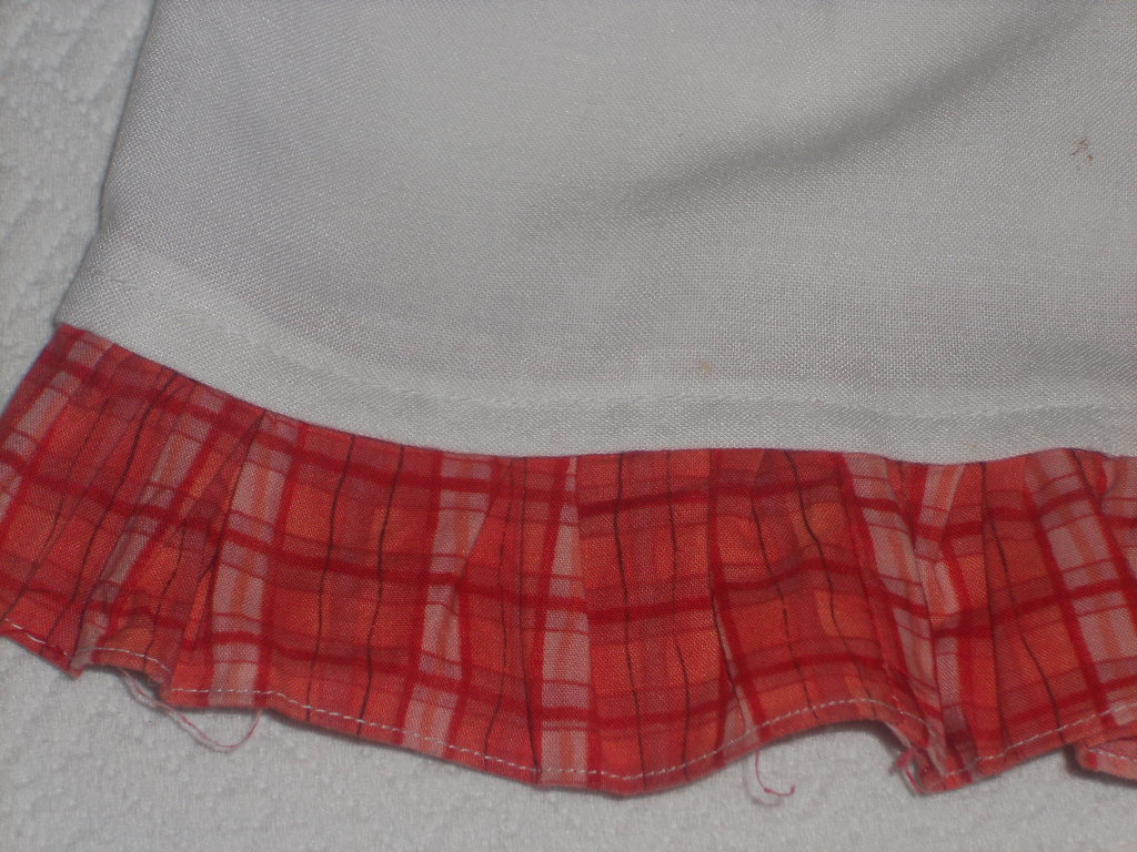 Piegare l'orlo della balza sul rovescio e ribatterlo sul dritto con un'impuntura a 1,5-2 cm dal fondo insieme alla balza a fiorellini.